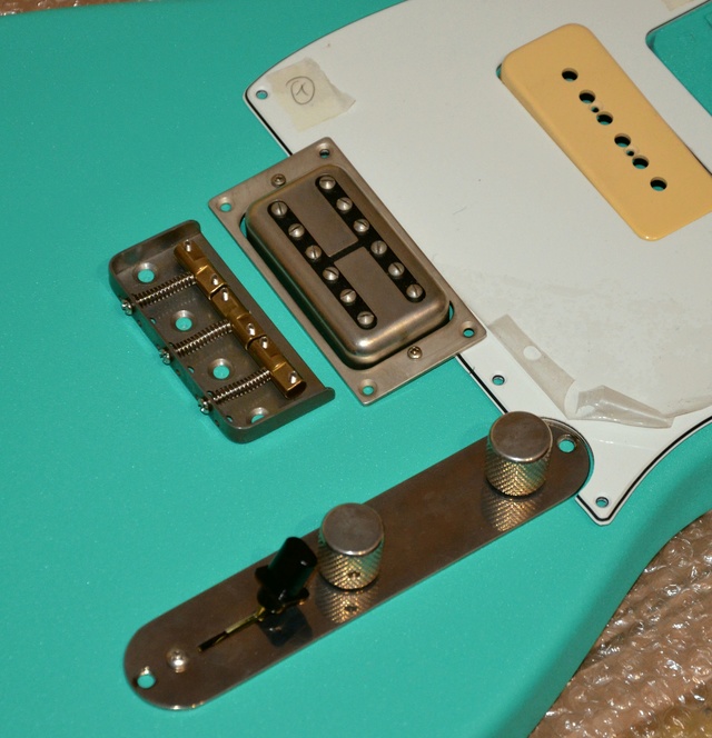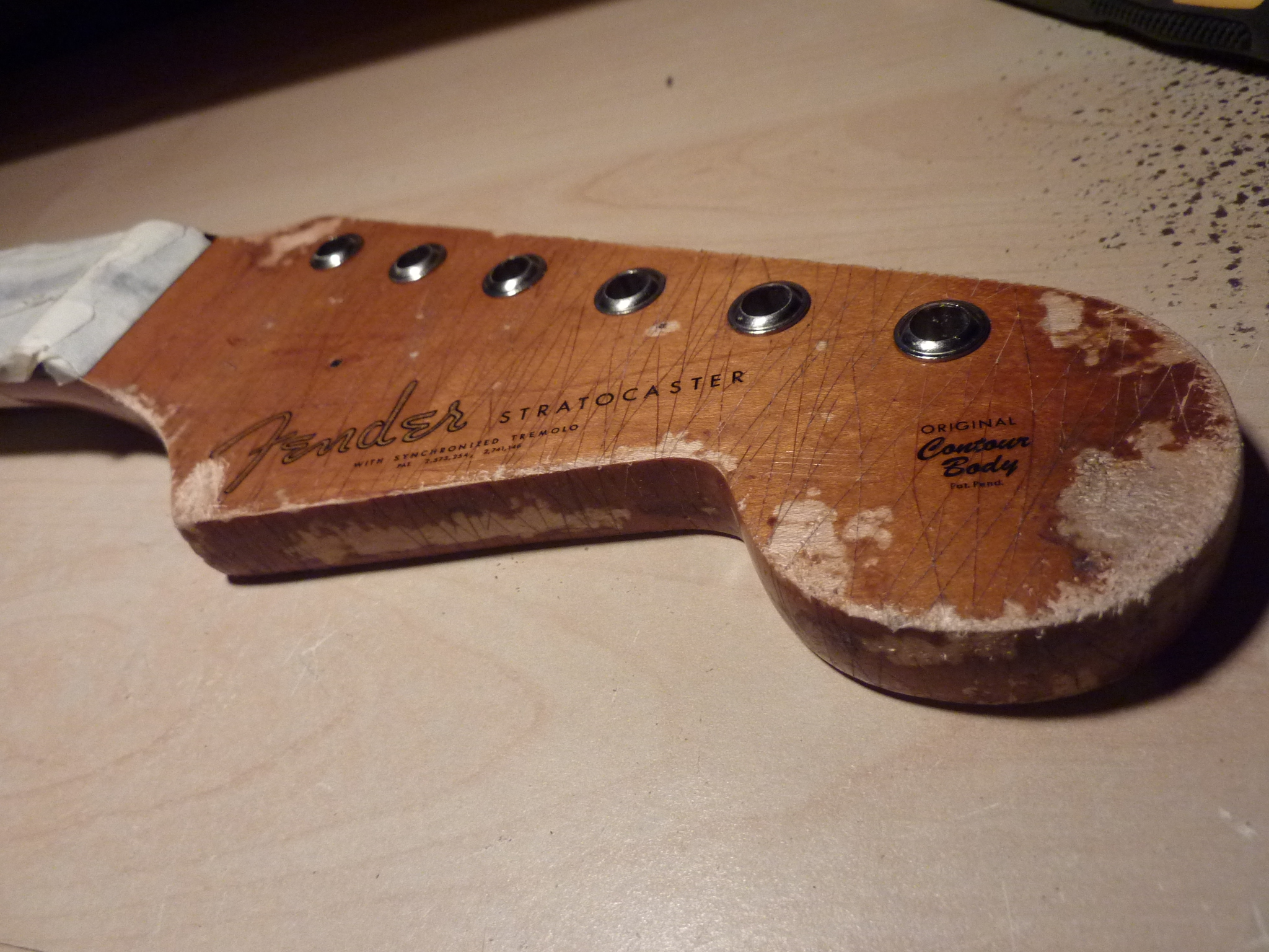 - projet de 2014 après essai d'une 54 60ème anniversaire qui ne m'avait pas emballé : sonorité quelconque et choix des bois (noeuds, taches) un peu dommage pour ce modèle anniversaire. Et du coup, en me baladant chez Warmoth, je vois ce corps Swap Ash 1 pièce super léger et un manche 1 pièce érable avec un profil bien épais (et un léger flame sans supplément de coût). Bingo ! Un chevalet Fender Pure Vintage (pontets Fender Pat. Pend.) et un set de micros Fralin Real '54 (aimants Alnico 3) et j'avais l'essentiel pour me monter ma propre 60ème anniversaire (les autres petits détails de la 54 étant les plastiques et le T pour les cordes). Bilan, une strat juste en dessous de 3kg, un manche V plutot épais, des specs assez proches d'une vrai 54.