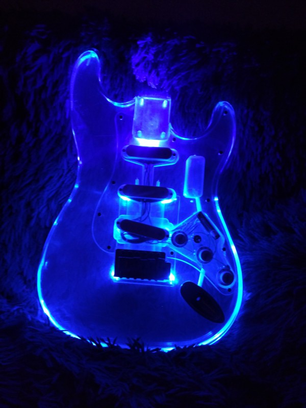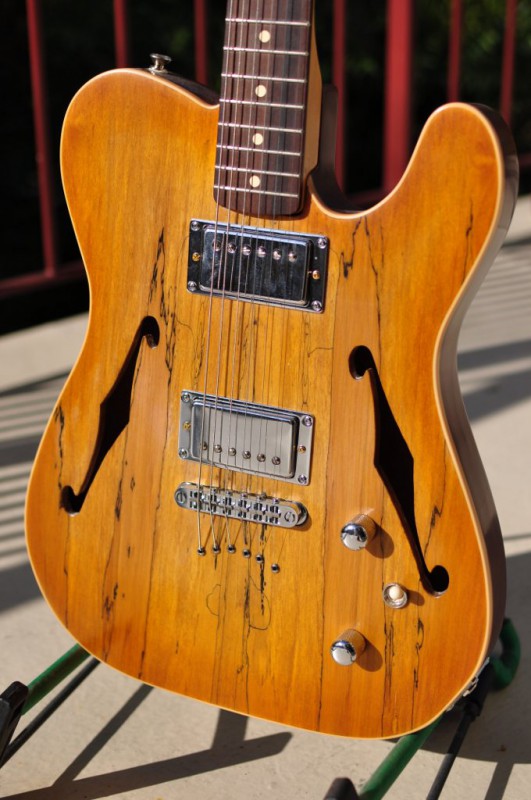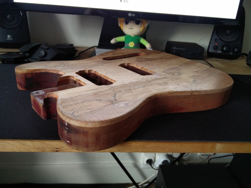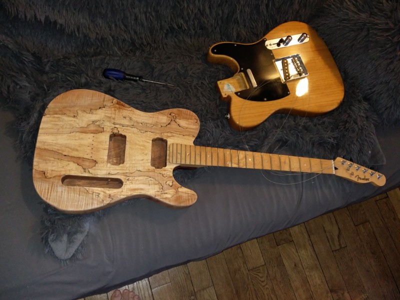 Dans le lot j'ai un corps de strat transparent type aliexpress qui pèse une tonne, un corps en acier d'origine inconnue, à voir... Mais surtout un corps de Telecaster avec un style plutôt sympa.