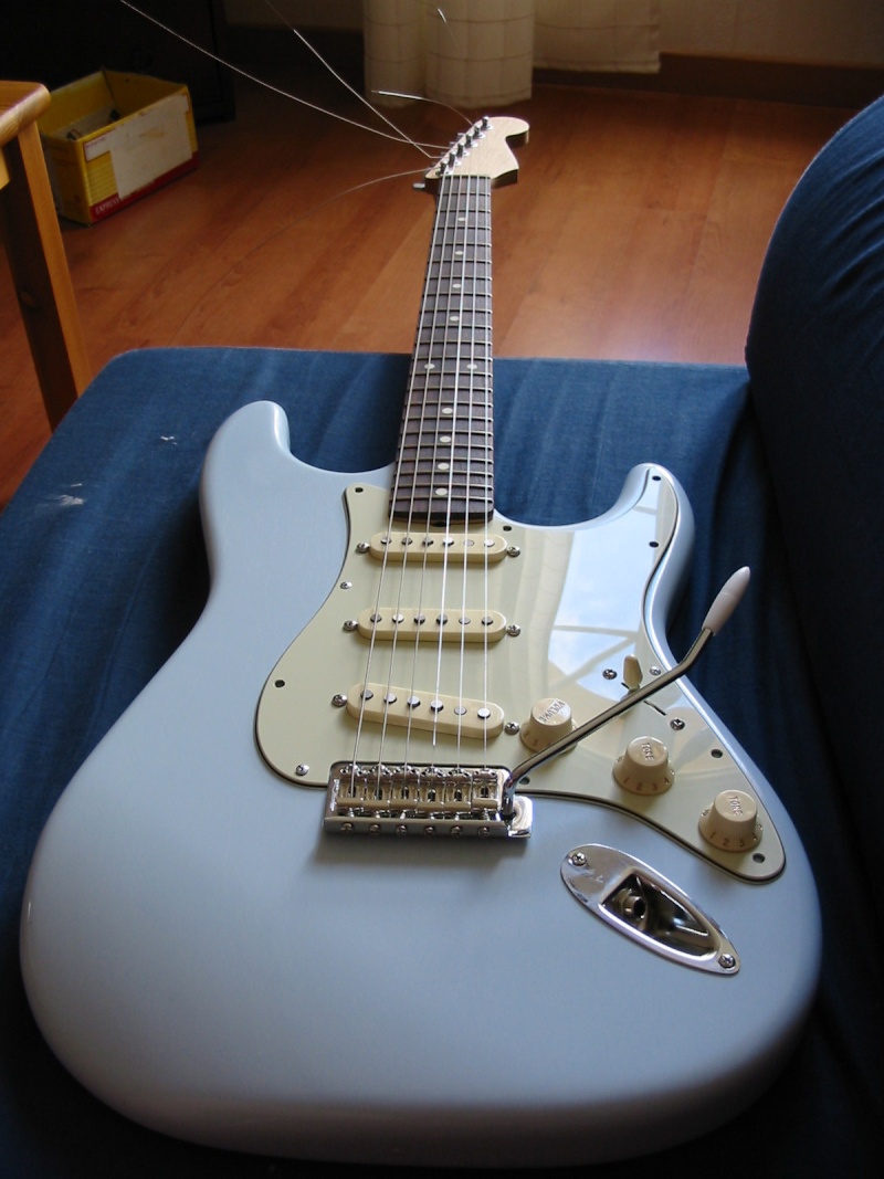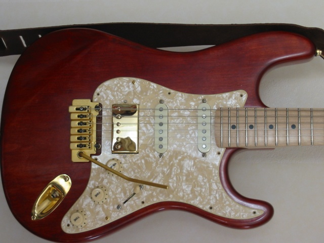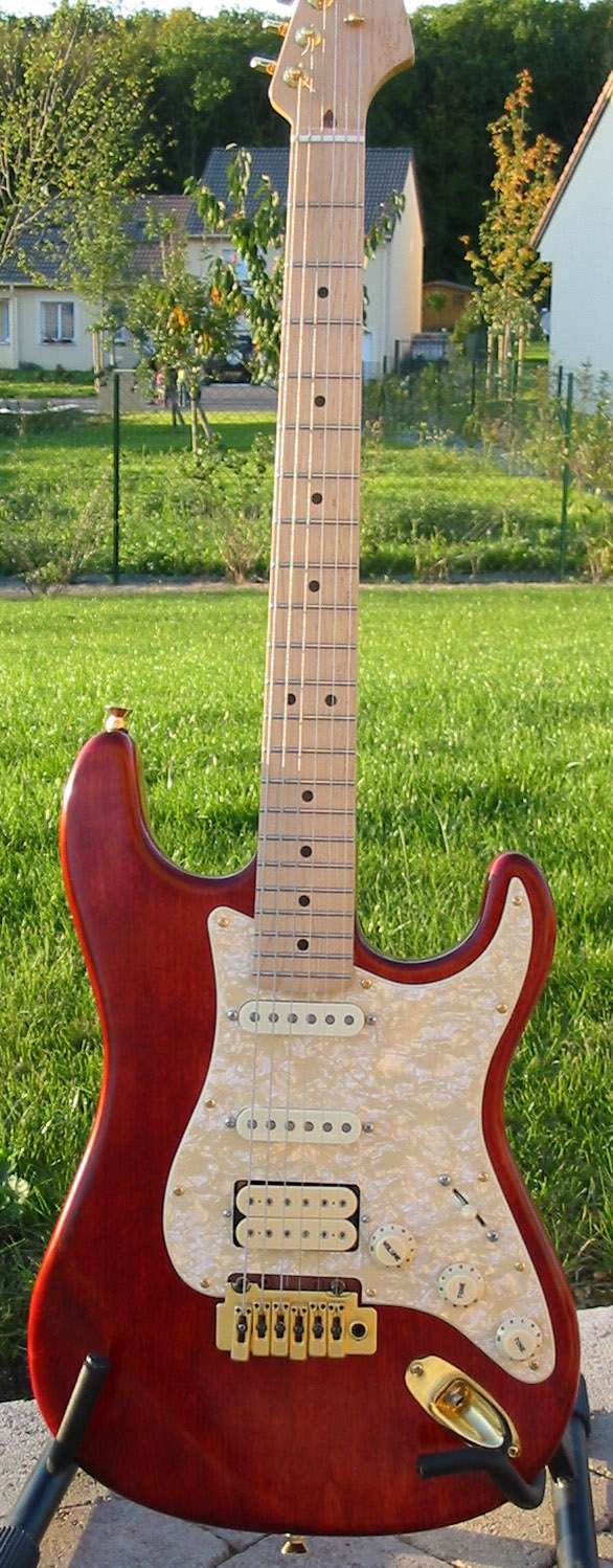 Elle a été détronée par ma seconde strat : corps aulne (origine KCPI), manche Allparts SRO-C, Wilkinson WV6 bloc acier, micros Klein 59, méca Schaller.