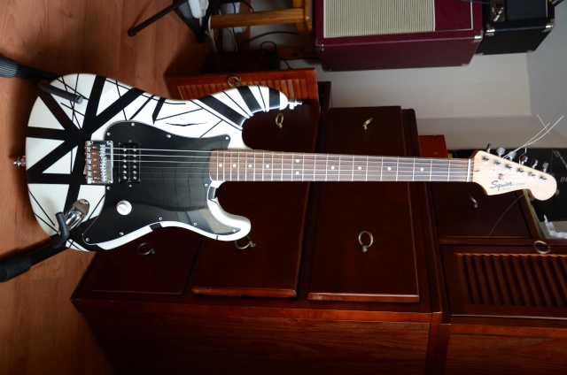 J'avais vendu le manche Warmoth, et j'ai refait le corps de ma première strat en version hardtail EVH, à pas cher (bombes peinture et vernis de chez bricoman !), d'abord montée avec un manche Squier pas cher mais mauvais et pas adapté (talon trop épais), j'ai ensuite trouvé un manche Fender mex quasi neuf.