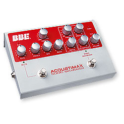 BBE Acoustimax, qui fait 4 pédales en une : préampli (mon micro M1 étant passif, c'est indispensable), égalisation, "maximizer" (effet "Sonic Stomp" intégré, qui booste les harmoniques) et boîte de direct (sortie XLR ou jack, au choix).