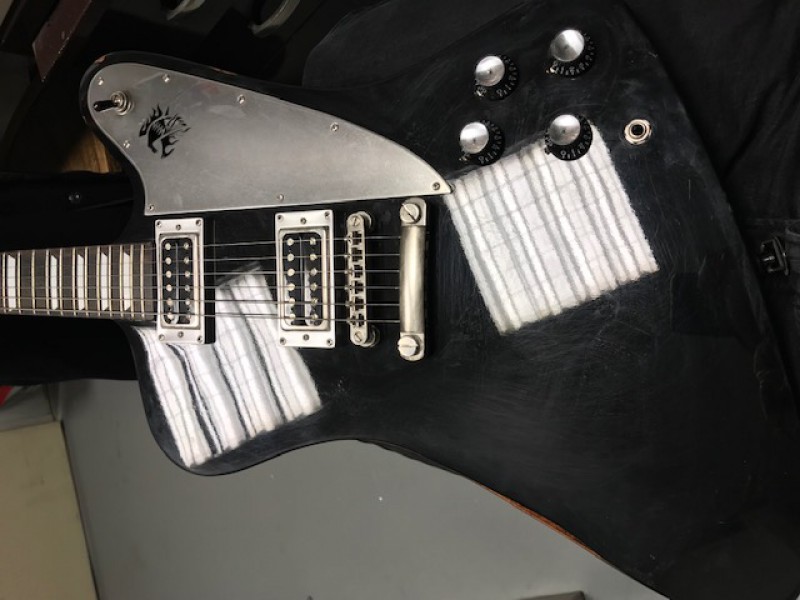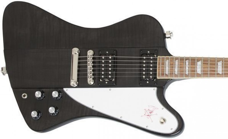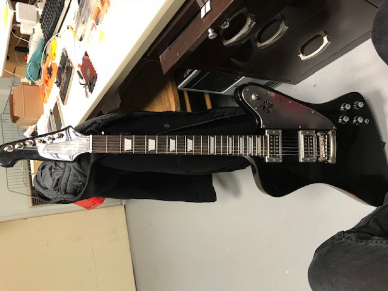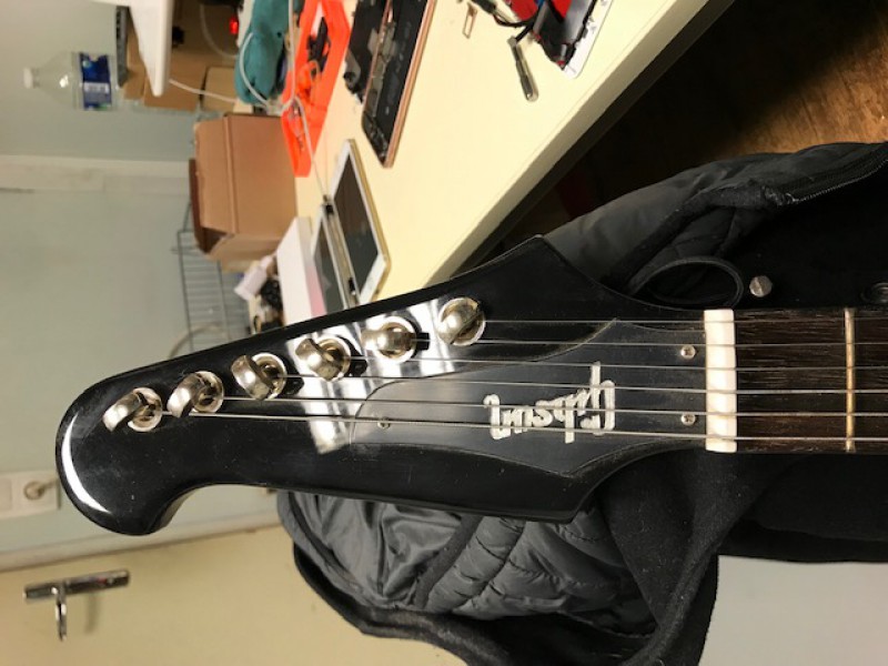 Ça pourrait bien finalement être une Epiphone Firebird Studio, maquillée avec des inlays autocollants trapèzes pour cacher les Dot ???