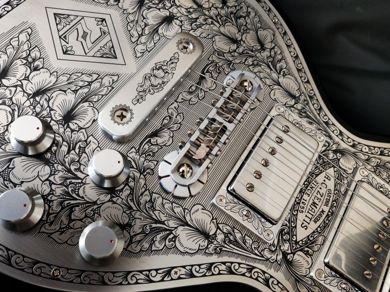 Autant dire que la jouabilité est exceptionelle. Quant au son, on sait qu'à l'origine, la plaque d'alu devait servir à mieux isoler/blinder ces guitares (ce n'est qu'après qu'on a conseillé à Zemaitis de les décorer): ça fonctionne parfaitement, redoutablement silencieuse, pas le moindre buzz.