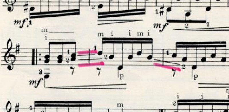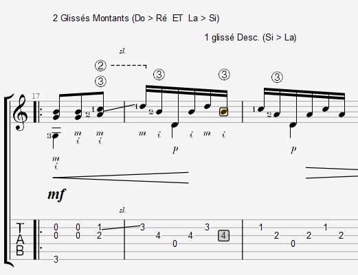Je voulais rentrer dans Guitar Pro une petite partition d'étude classique qui contient à un certain moment des glissés, et je n'arrive pas à les reproduire dans Guitar Pro. Je n'arrive qu'à mettre dans GP le 1er glissé (Do/Ré) sur la 2eme corde. Pour le second (La/Si et versa-vice) sur la 3eme code, GP ne veut pas les notifier.