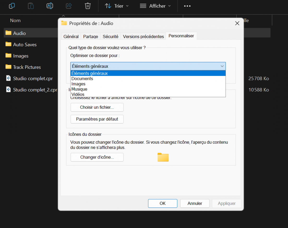 Cette "optimisation" se fait plus ou moins automatiquement. Et régulièrement, depuis des années, je repasse mes dossiers en format "éléments généraux". Mais rapidement (je n'ai pas analysé comment ni quand) le dossier repasse automatiquement au format que "Windows" croit être "optimisé" pour mon utilisation. En bref, mes dossiers de MAO repassent régulièrement au format "Musique". Et je n'ai plus accès directement à ces informations qui me sont importantes. Et ça m'énerve