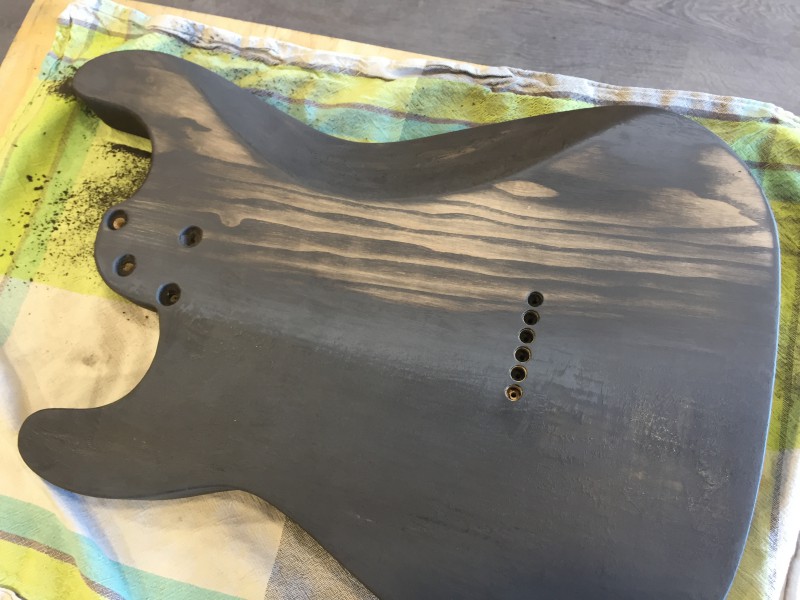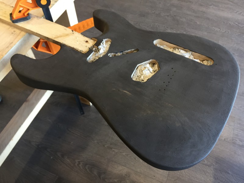 les consignes de Nitorlack, j'ai appliqué à la brosse mais ça a séché super vite. Si bien que le grain filler a croûté sur la guitare et enlever l'excédent à la spatule a été difficile: