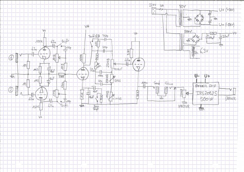 Honnêtement, pour les 47 n en entrée, je suis pas familier de ce genre de chose, c'est plutôt résistance de grille direct, sur les amplis que je fais... Mais je me suis pas foulé, j'ai copié-collé le schéma de preamp du boogie, sauf l'erreur au niveau du tone stack... Ils aiment bien foutre des conneries dans leurs schémas, boogie, j'ai remarqué...