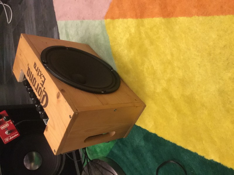 L’ampli est un Roland cube 40 vintage 1983 made in Japan, ça sonne fort et le son clair est bon. Le hp d’origine est monté sur un autre ampli car il est exceptionnel. Celui ci est repris d’un fender frontman 25r est est moyen donc sera changé dès que possible.
