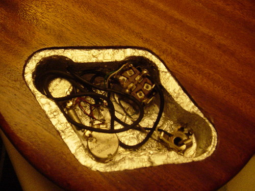 . Je decide d'un coup de passer en passive (j'en avait marre de changer les piles). J'installe donc deux micros achetés chez custom shop parts, est là, je commence à me rapeller ce que s'est la basse passive et quels sont les inconvenients (j'ai joué que sur des actives depuis 12 ans). Notamment, ça capte tous le bordel electrique - les variateurs des lampes halogènes, les écrans PC etc etc. Parce qu'il y a zero blindage sur cette belle!