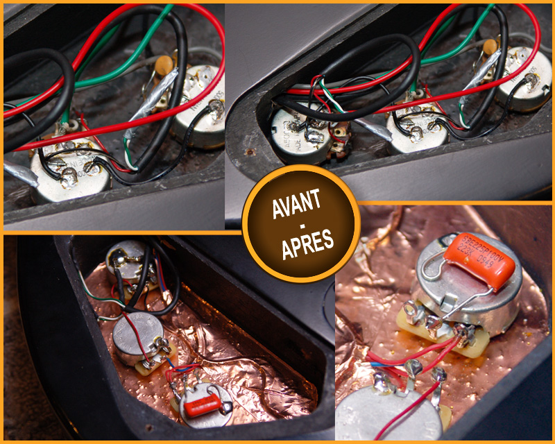 En général, on fait simplement partir un fil de l'étoile du potard de volume, que l'on vient souder sur la feuille de cuivre de la cavité, via une petite visse.