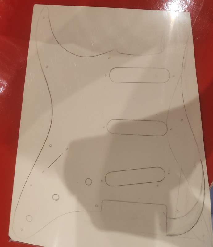 Pour la solution finale, je vais ajouter une pièce de pickguard que je vais masquer rapidement avec un stickers discret pour éviter de faire trop différent