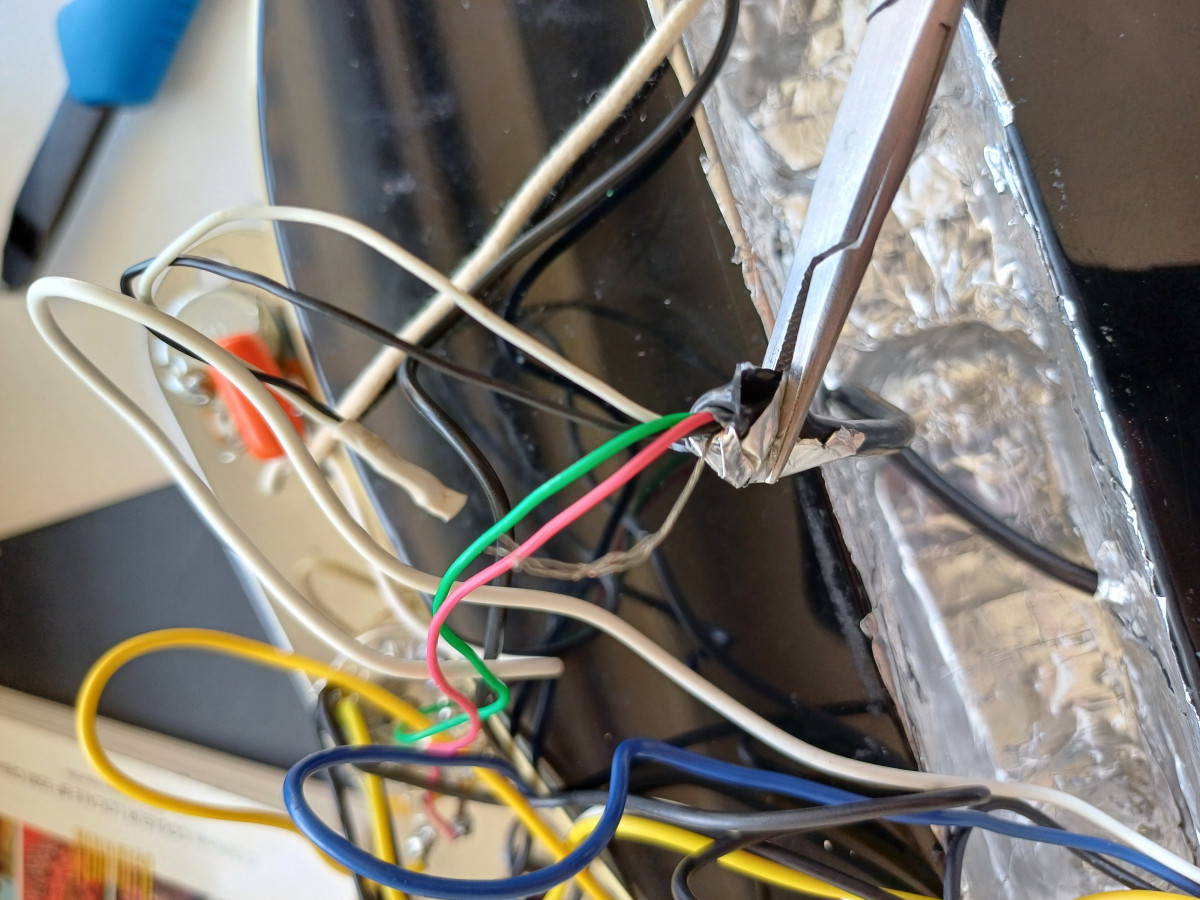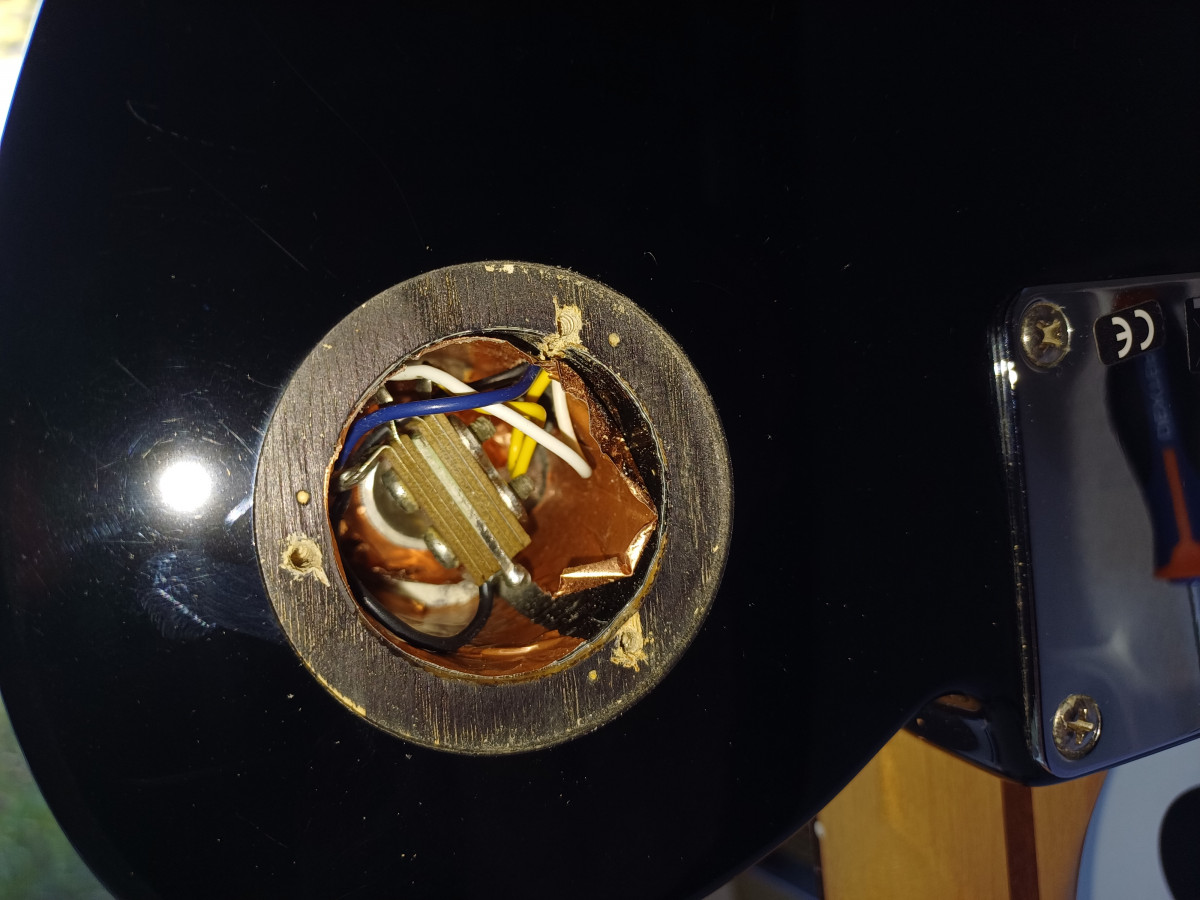 Mon prédécesseur devait aussi trouver qu'il y avait du buzz puisqu'il avait fait un blindage au cuivre du compartiment switch, qui ne sert à rien puisque plein de trous et non relié à la terre. Je l'ai donc viré (ce qui n'a rien changé...). Je n'ai pas démonté le chevalet et les micros pour l'instant.