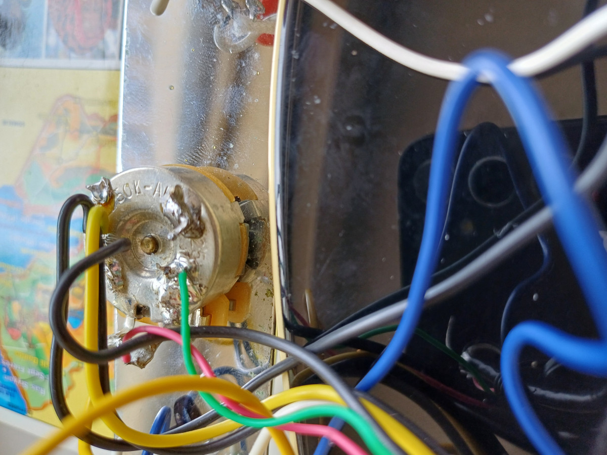 - Le potard Vol 2 et le potard Tone ne sont pas reliés à la terre générale du potard Vol 1. On voit pourtant des stigmates de soudure dessus, laissant penser qu'ils l'ont été. La plaque de la trappe étant métallique est-ce elle qui fait la connexion avec la terre entre tous les potards, auquel cas un câblage supplémentaire pourrait faire boucle de masse, raison pour laquelle ils auraient été enlevés (pourtant sur le diagramme d'origine il y a bien un fil de masse entre les deux volumes)?