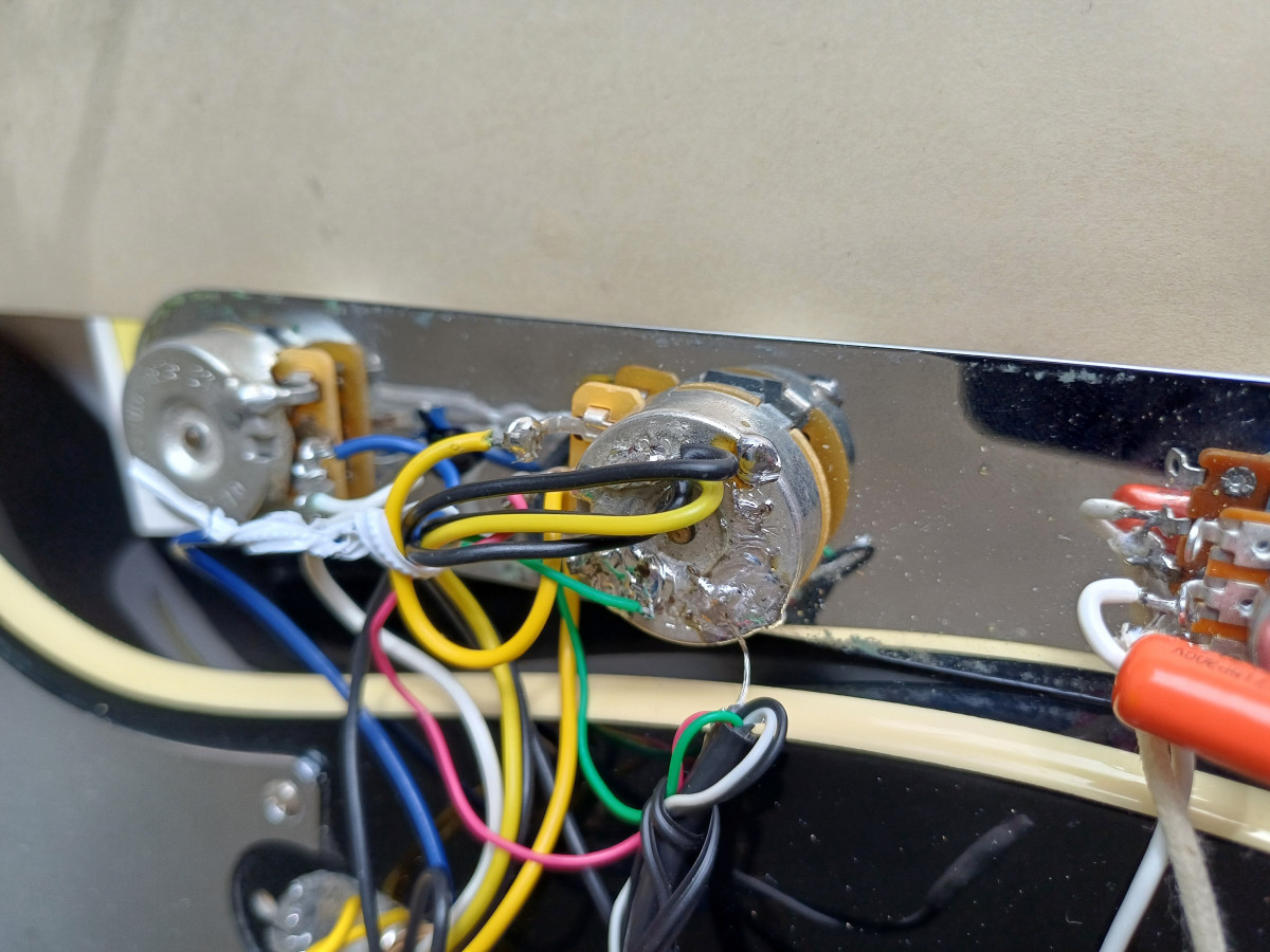 - Le point chaud du neck (en blanc) est connecté à la patte latérale du potard Vol 2, et la sortie vers le switch (en bleu) est sur la patte centrale alors que sur le schéma Fender c'est l'inverse (alors que pour le bridge c'est conforme au shéma Fender). Cela peut-il avoir une incidence sur mon problème de Buzz ? (j'ai trouvé cette vidéo où le gars avait un problème similaire mais sur les deux potards: