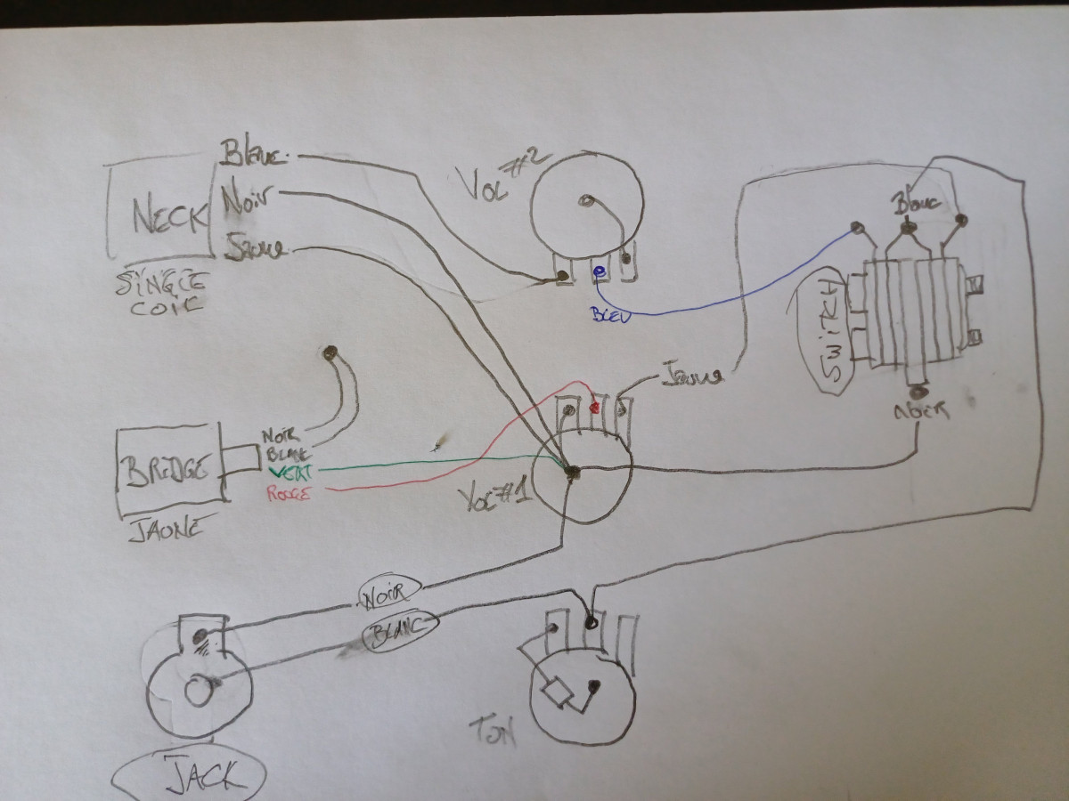 Pour une meilleur compréhension, je vous ai fait un joli dessin du câblage, et j'ai réussi à récupérer le diagramme d'origine (sans tone) de Fender :