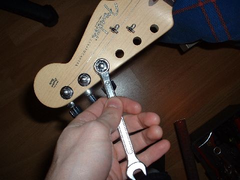 On remplace ici les mécaniques à bain d'huile d'origine d'une strat par des schaller autobloquantes.