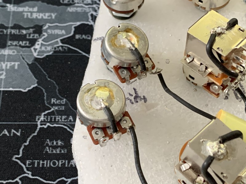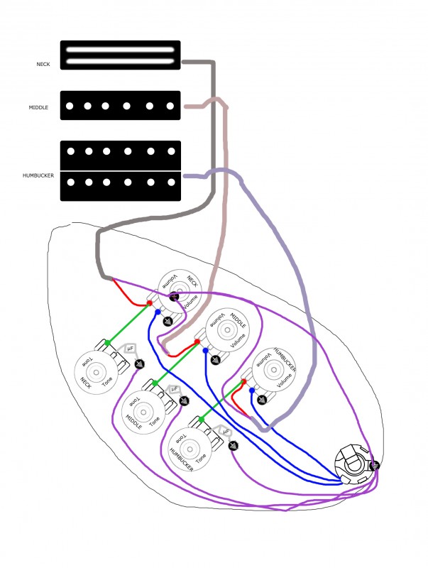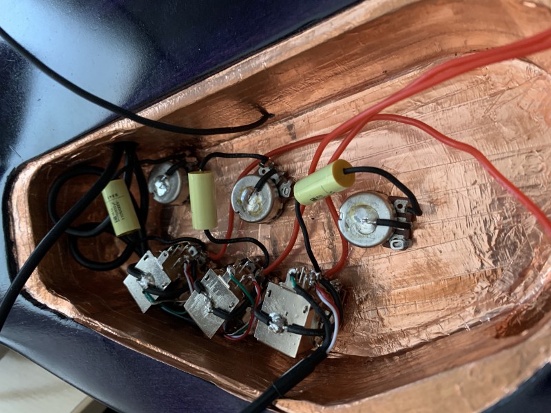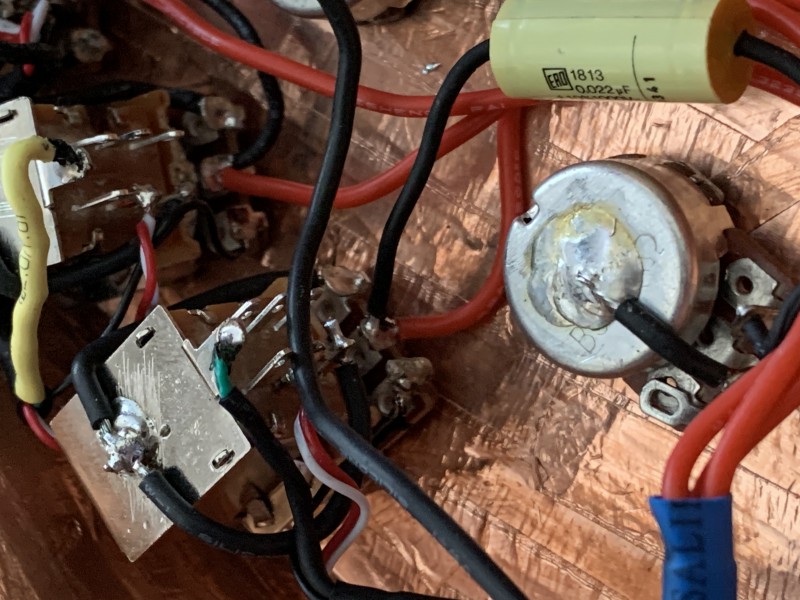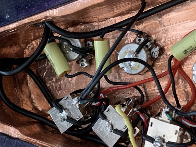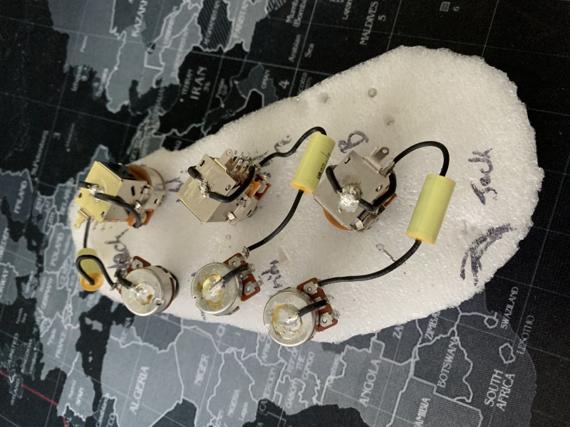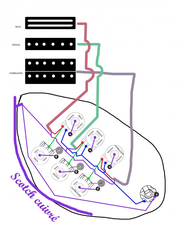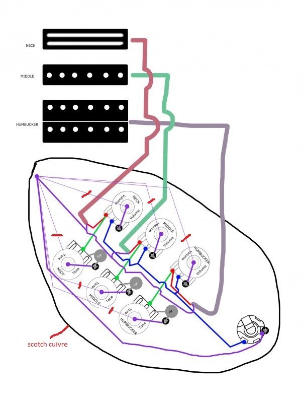 Ben en fait normalement un Volume à 0 sur un micro fait le même effet qu'un switch/toggle en off d'après mes lectures sur les fofo ricains. Donc d'avoir les 3 micros câblés en "direct" sur le jack avec des volumes permet plus de nuance qu'avec des switch/toggle. c'est plus "long/fin" à régler, qu'un simple "CLAC" du switch, mais je vais rester sur cette config : 1 vol + 1 tone par micro et ensuite, je ferai des blends selon mon humeur.