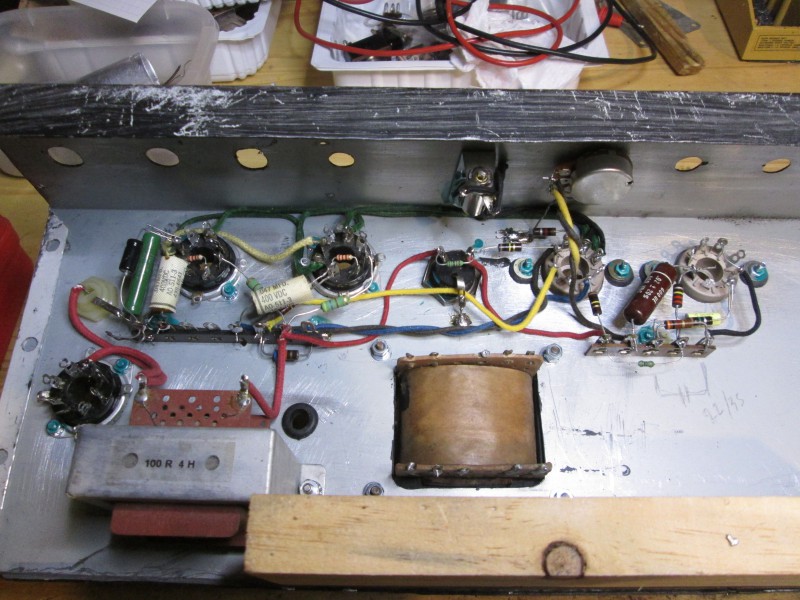 Vue du coté câblage, avec la self de filtrage ! Le morceau de bois sert juste de cale pour que le châssis tienne sur l'établi !