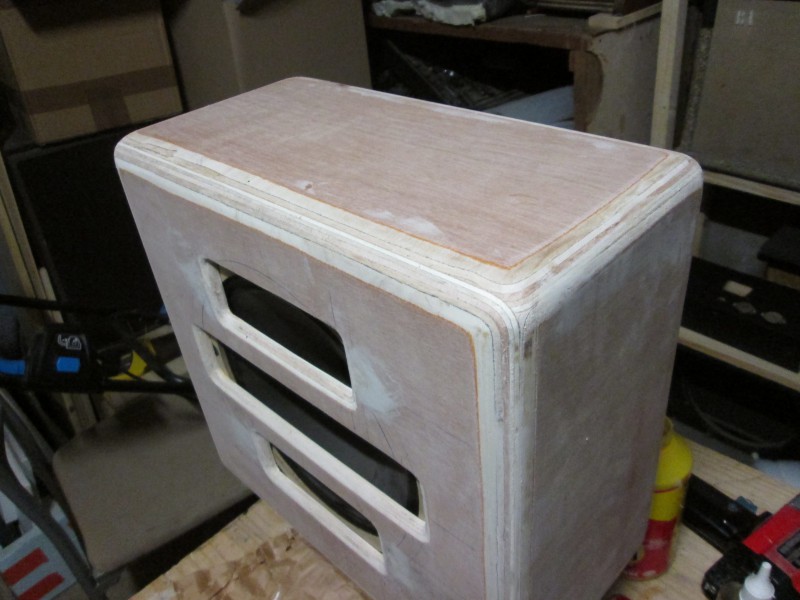 1ère étape, le cab. CP de 12, un poil plus épais que le cab d'origine et arrondis à la défonceuse puis à la râpe et papier de verre. Photo en cours de réalisation :