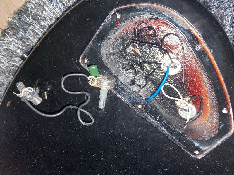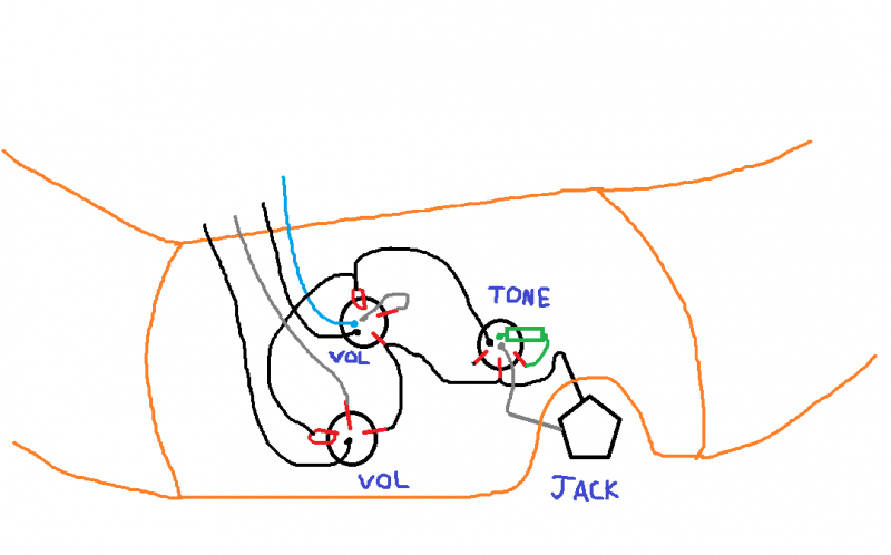 J'ai récupéré une vieille basse électrique en bon état. Seulement elle ne fonctionne pas une fois branché puisque les fils sur les potards ne sont pas tous soudé. Puisque je n'y connais rien je suis venu demander votre aide. J'ai dessiné sur paint afin de vous montrer la situation (j'ai fais avec les moyens du bord).