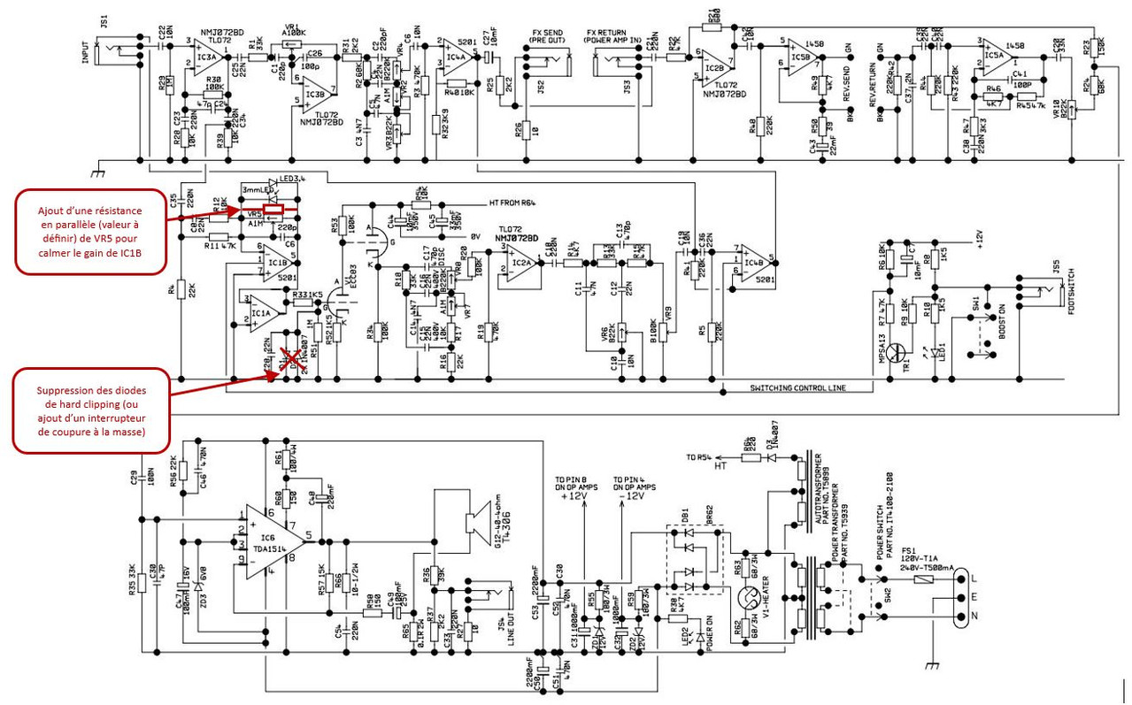 Souhaitant calmer le gain du canal boost, j'ai décidé d'agir sur deux paramètres : le hard clipping et le gain de l'AOP IC1B en amont de la lampe :