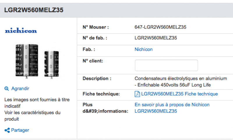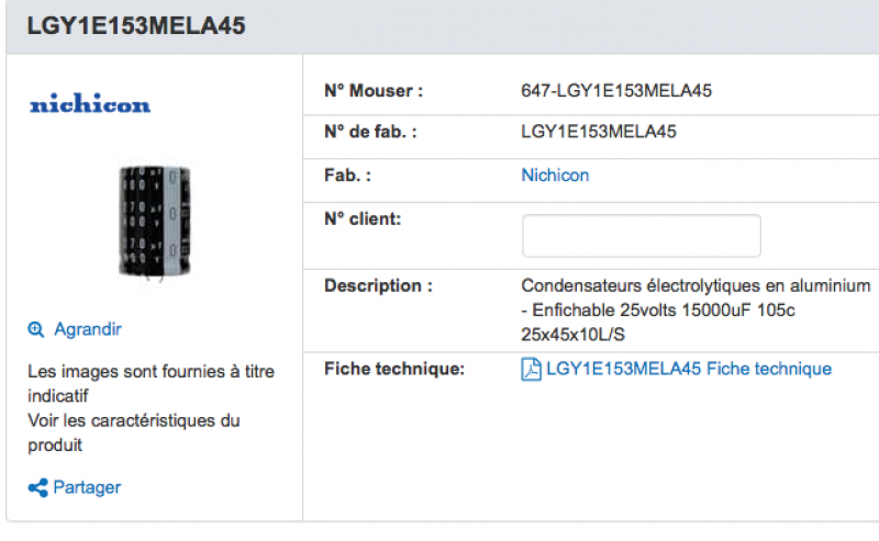 je dois remplacer un 15000 uf 25v et 5 lp560m450a1p3 (56 uf 450v)