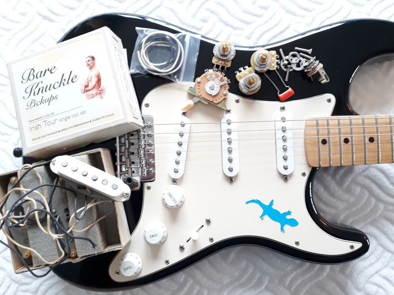 Les nouveaux micros seront des Bare Knuckle Pickups Irish Tour single coil en RWRP, 56' Vintage Stagger et parchment cover achetés d'occase pour pas trop cher car neufs ils valent plus cher que la gratte... 😂