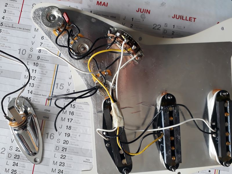Les potars, le sélecteur, la capa orange... Les deux points noirs sur le micro du milieu sont l'indication d'un câblage inversé prévu pour supprimer les hums sur les positions intermédiaires, comme avec des doubles...