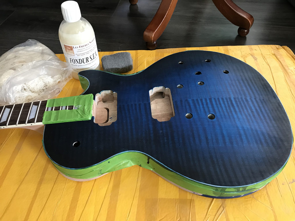 Je sais que le bouche pores n'est pas nécessaire sur l'érable, cependant, j'ai quand même passé deux couches de fondur sur le top pour fixer les couleurs du burst avec un léger coup de laine d'acier extra fine entre chaque.
