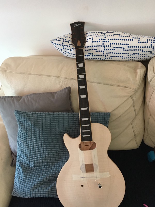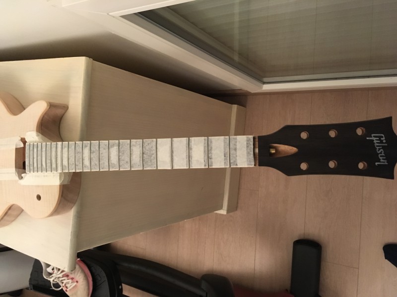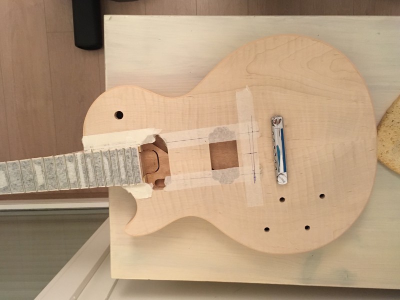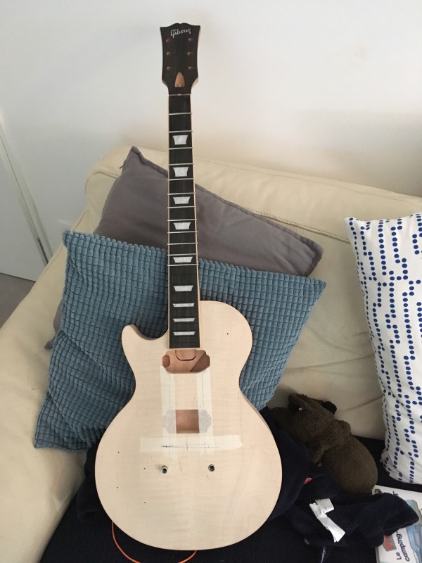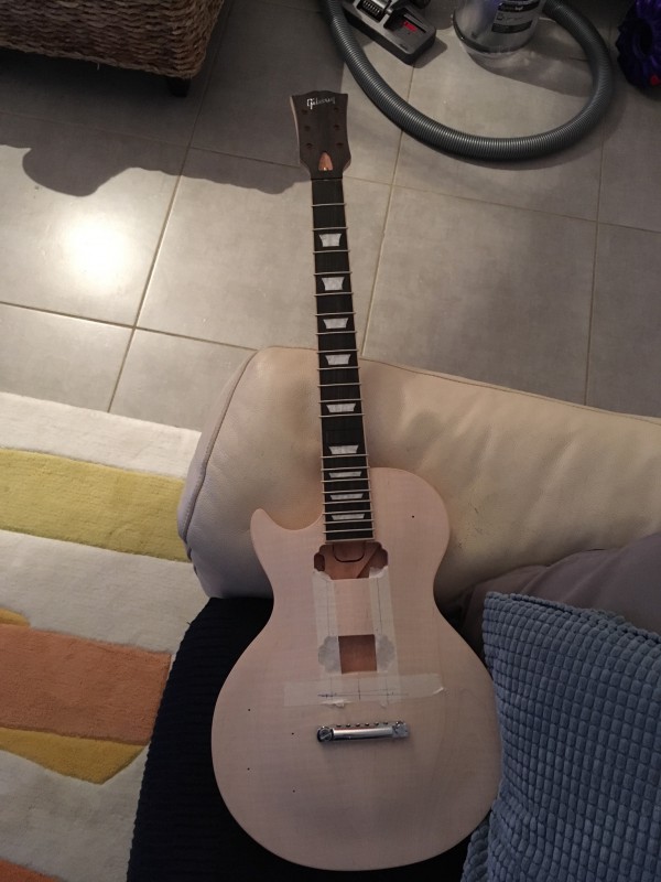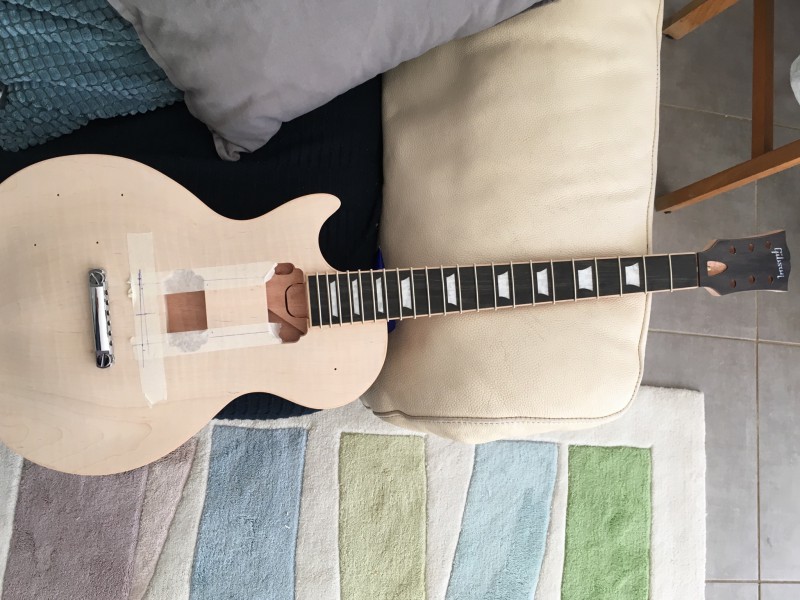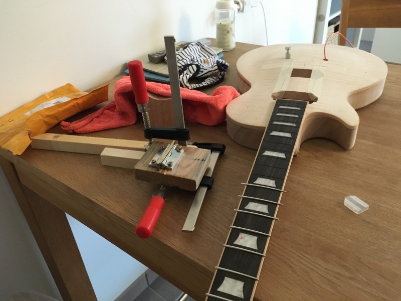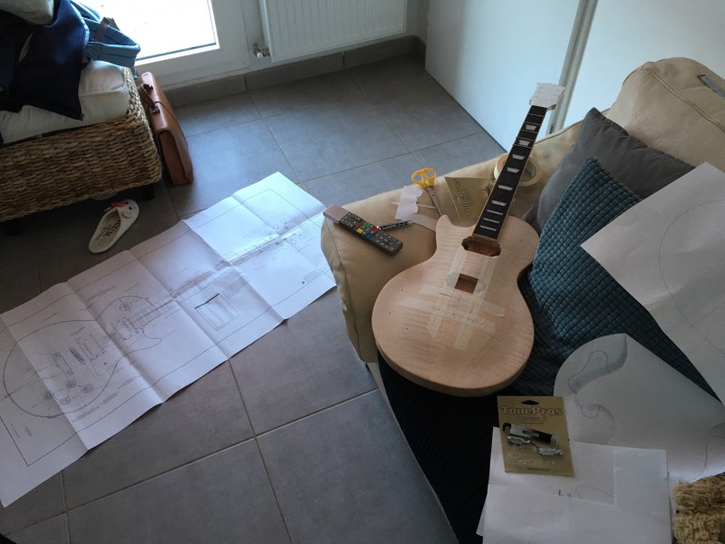 J’ai avancé ce matin... perçage des trous du cordier, des mécaniques et du fil de masse qui part du cordier. J’ai pris une mèche de 3, et en prenant appui sur une plaque d’acier pour ne pas abîmer mon trou de cordier, j’ai percé depuis la table vers la cavité.