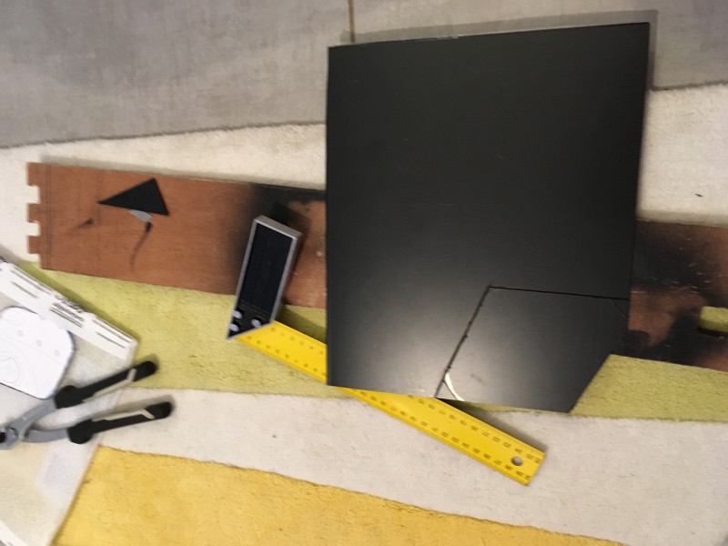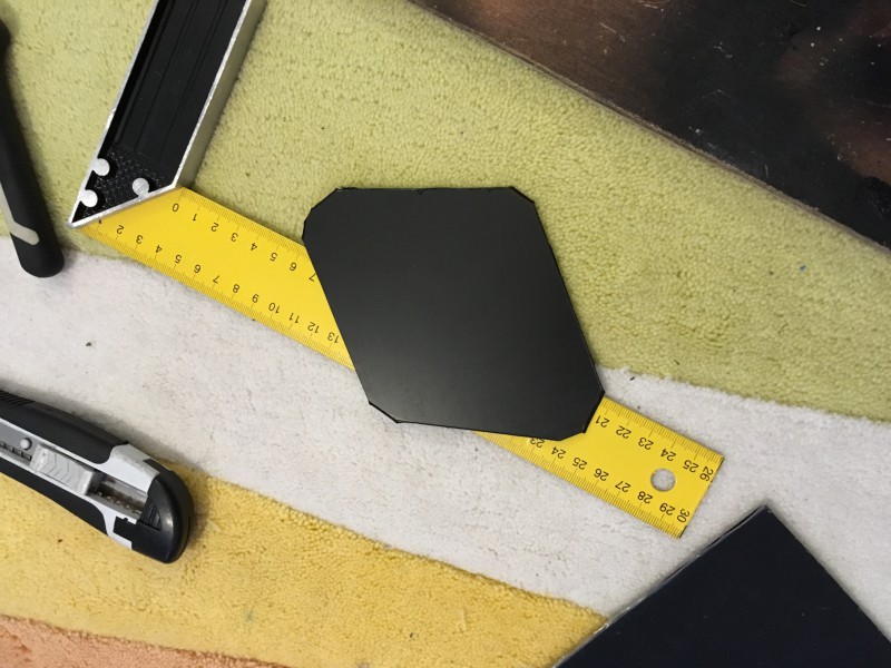 On profite des moments disponibles où ma compagne se repose et les enfants sont devant un Disney pour démarrer la fabrication de la coverplate de l’électronique. Après confection d’un template papier, on dégrossit la plaque d’ABS noir de 2,3 mm d’epaisseur (Vintage correct).