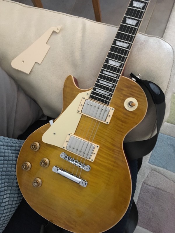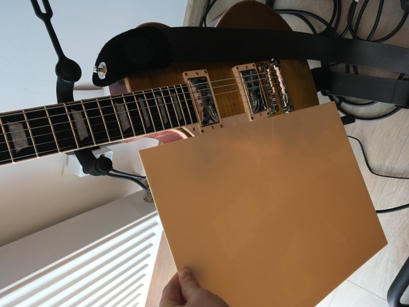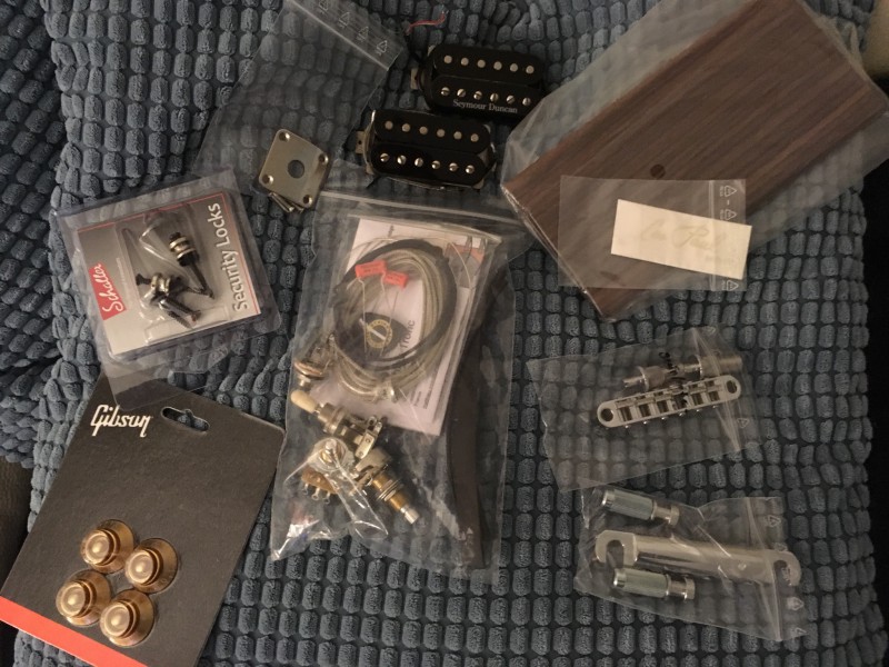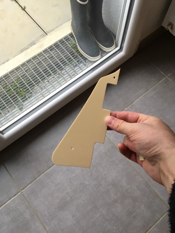 J’attends les pickup rings et le pocker chip crème, le sillet black Tusq, les frettes Jescar, les mécaniques Gotoh SG301 18:1 (type Grover Rotomatic), la plaque de pickguard en 2,3 mm pour faire un pickguard sur mesure. Les backplates seront faites dans la même plaque que la mienne.