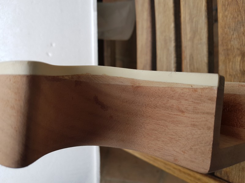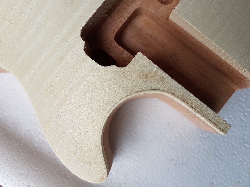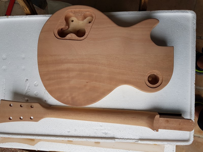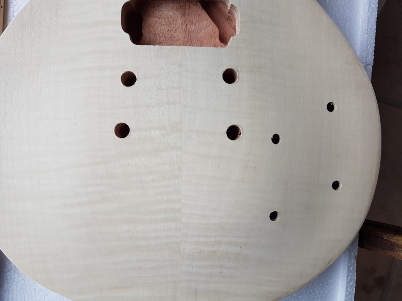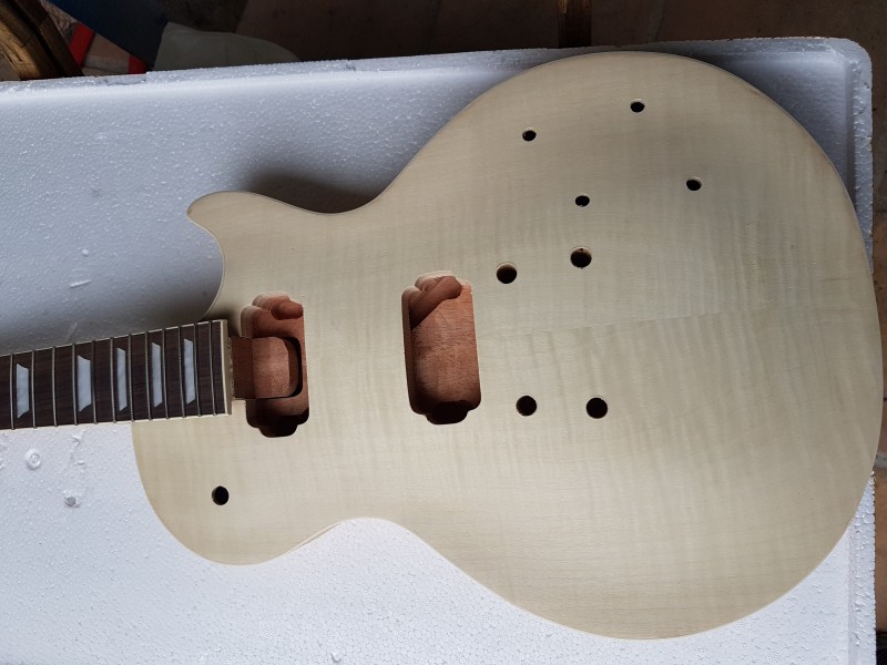 Corps acajou (africain demandé) une pièce, table érable canadien flammée massive, manche acajou une pièce, truss rod vintage type Gibson, touche ébène du Gabon.