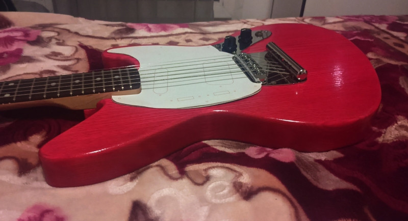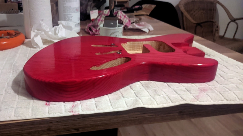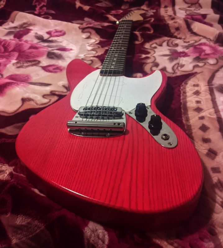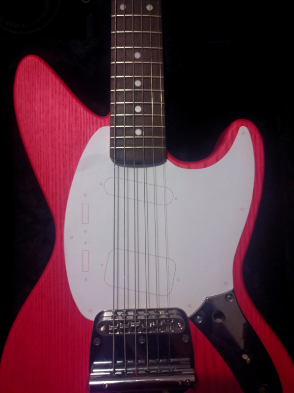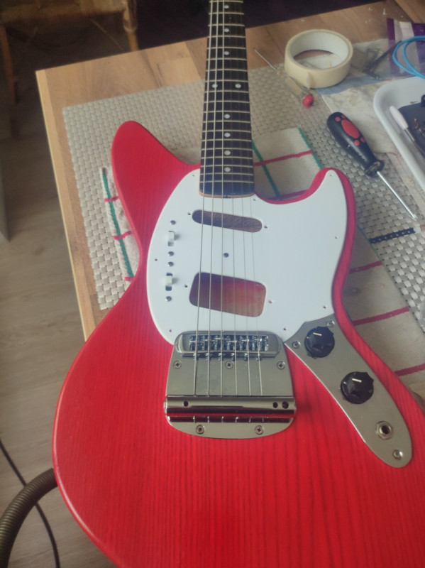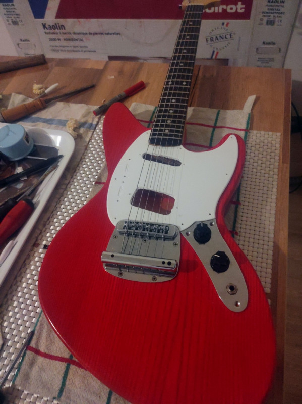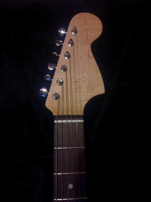 J'ai aussi pris des mécaniques et la plaque manche Fender.. et monté des cordes sur un chevalet tune o matic (pris sur ma LAG Roxane) installé un sillet graphite ..