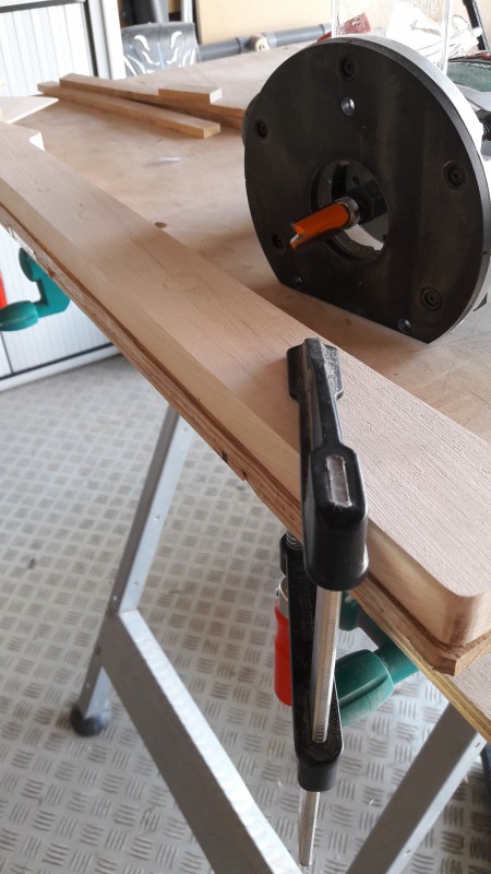 Je me suis donc équipé d’une défonceuse + fraise de 6mm + fraise à copier (1 fraise de 8mm livrée avec la machine), un ponceuse orbitale et son lot de disques abrasifs de grains 80 à 320, une ponceuse oscillante Triton (ça c’était mon gros plaisir), un bon rabot, des serre-joints de plusieurs tailles, de bons ciseaux à bois, une pierre à affuter, des papiers de verres 80/120/180/240/320 à 400, de nouvelles mèches bois de qualité, une mèche bois longue (40cm), 1 marteau embout plastique, 1 outil pour copier les formes… tout ça en magasin de bricolage ou Amazon.