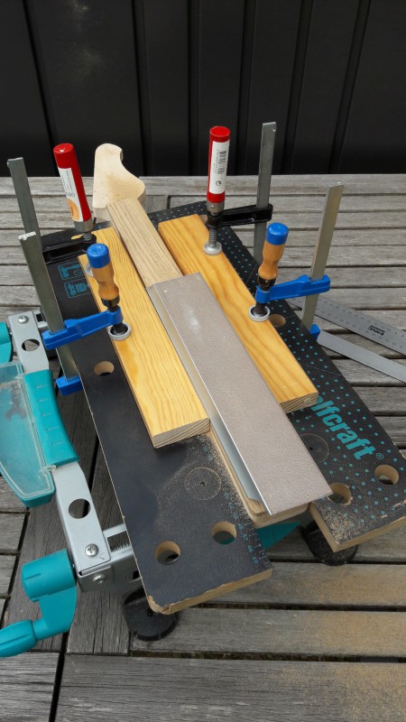 Afin de pouvoir réaliser au mieux mon projet, je me devais (ou avais très envie) de m’équiper d’un minimum d’outillage (classique et spécifique lutherie). On doit pouvoir faire avec des outils plus communs, moins chers mais j’ai pris le parti d’investir dans un minimum d‘équipement de qualité qui me permettront d’une part de réaliser cette guitare, d’autres guitares d’autre part (si tout se passe bien avec celle-ci), mais aussi de réaliser d’autres travaux variés à la maison. Et je compte les garder longtemps. Bref, c’est un budget conséquent qui vaut le prix d’une guitare. Encore une fois, c’est un choix personnel et j’espère que ça mettra un maximum de chance de mon côté pour réussir.