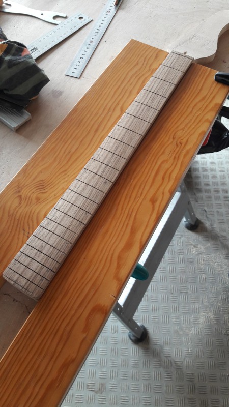 Pour la partie frettage et plus spécialisée lutherie, j’ai pris une lime shinto, des limes Iwasaki plate et ronde, une cale au radius 12’, un fret rocker, des limes spéciales pour frettes (mise en forme et finition), des gommes de polissage 1000 et 2200, une pince coupe frettes, une scie japonaise, des cales pour mesurer différents radius, un notched straightedge (je ne connais pas le nom Français mais c’est pour vérifier la planéité du manche)…La plupart chez Crimson Guitar et le reste sur Amazon.