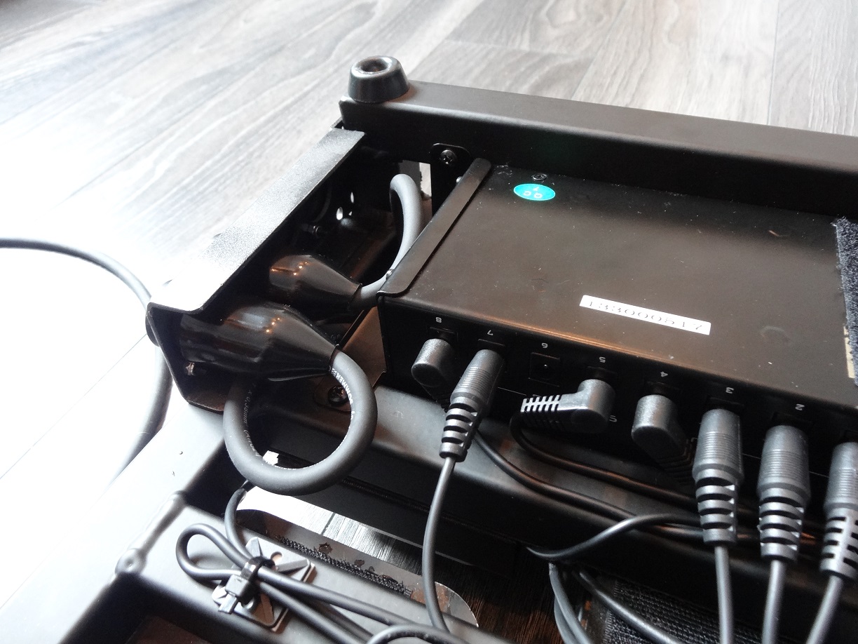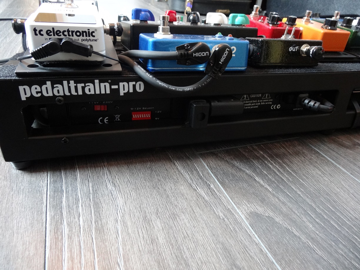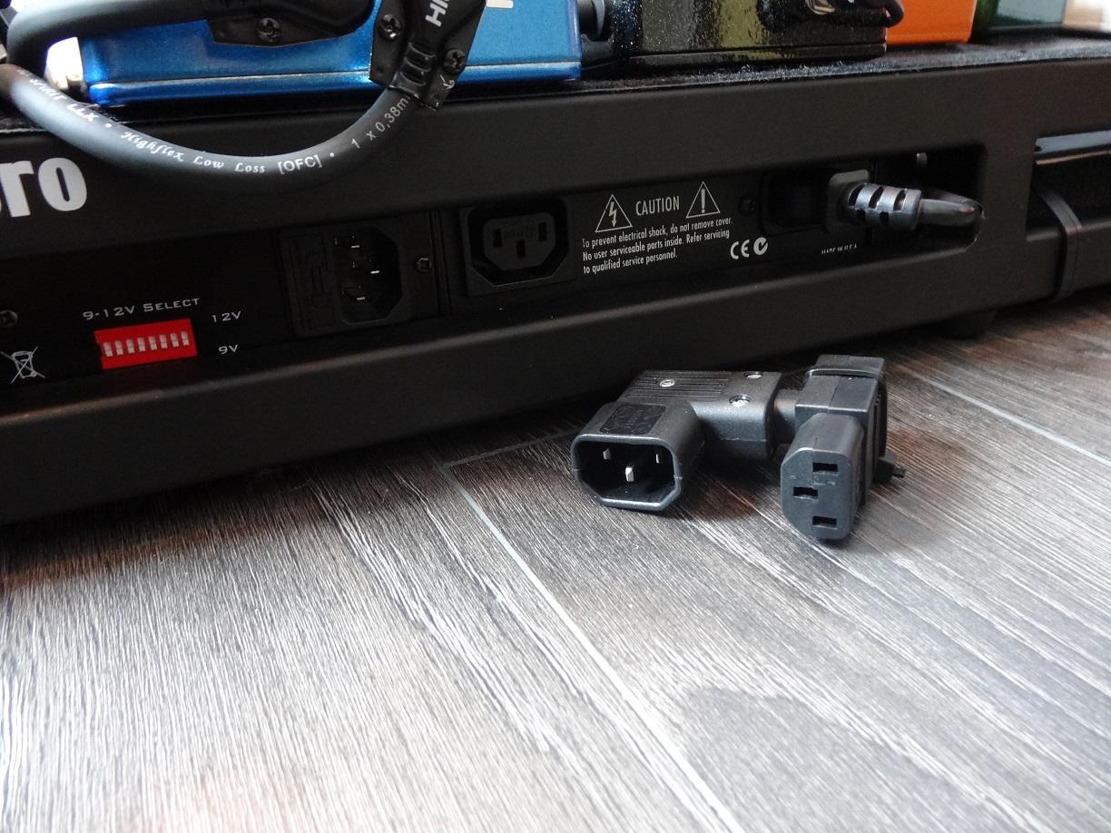 La Voodoo Lab Pedal Power 2 Plus a l'avantage d'avoir une sortie au format IEC qui dans mon cas est utilisée pour alimenter la Carl Martin Pro Power juste à coté.