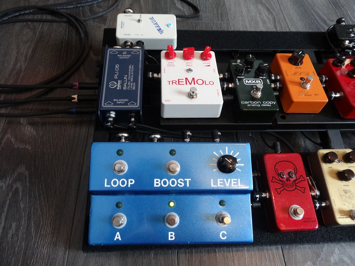 Et pour finir on passe par la section de sortie avec : Buffer => Kill switch => Megaswitch (qui permet de sortir sur 3 amplis séparément ou simultanément et qui contrôle la boucle ainsi qu'un ultime boost).