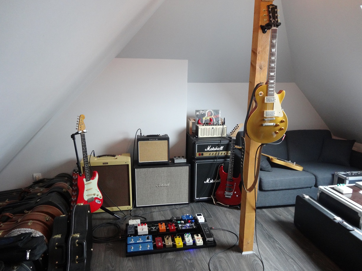 Ensuite je n'ai pas de photo de détail mais on passe dans différentes disto DIY histoire de varier les plaisirs : Treble boost Brian May => TS808 => Disto+ => Centaure => Plexitone (pas DIY celle-là)