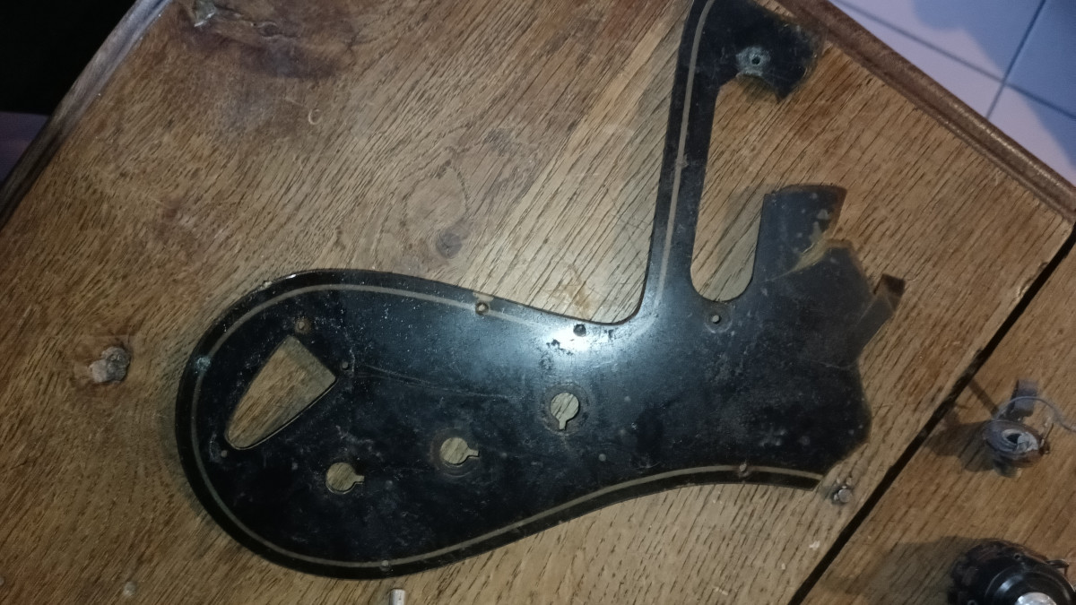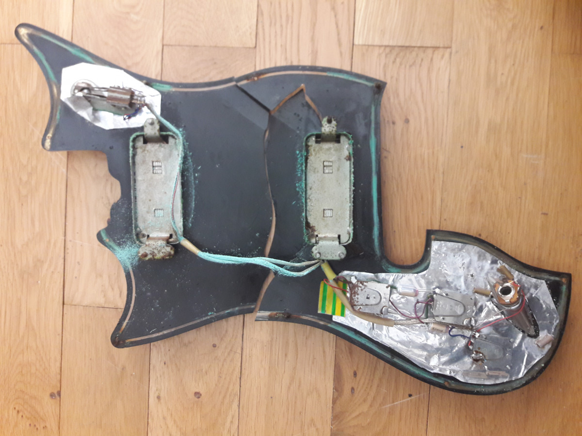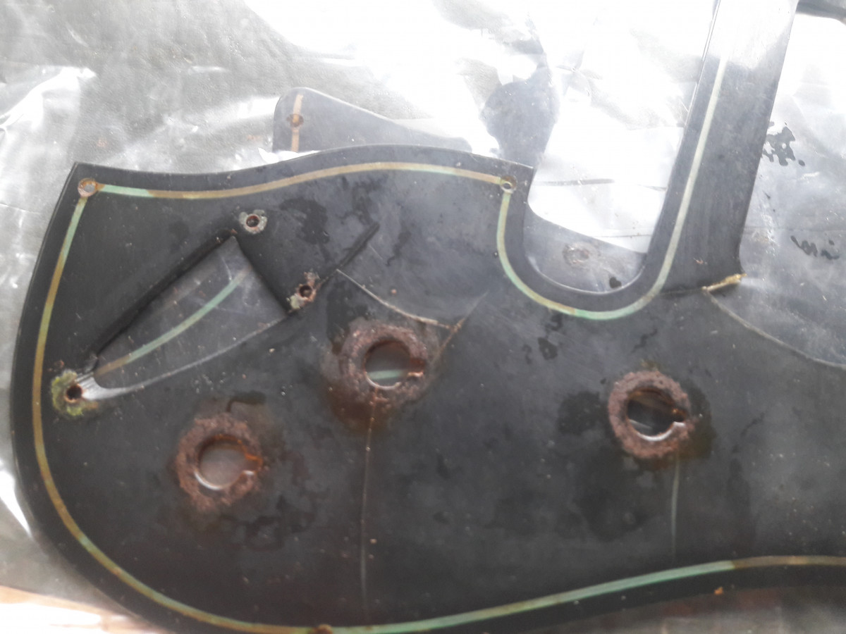 La basse est arrivée en bon état, je l'ai utilisée assez peu (j'ai toujours le jeu de cordes que j'ai monté en la prenant en main). Ce qui est étonnant (mais pas drôle) c'est qu'au fil des ans, elle a commencé à se corroder d'abord doucement puis à une vitesse inexplicable pour moi. Ca a commencé par la peinture du liseré dorée à l'envers du pickgard qui est transparent. Le liseré est devenu vert (oxyde de cuivre). Ensuite des petites piqures sont venues sur les chromes (caches micros, boutons). L'électronique a fini par poser des problèmes (1 micro puis les 2) et elle ne donne plus rien. Le pickgard (qui avait un pet) est également fendu dans plusieurs directions. La partie inférieure, non chromée, du pontet est toute rouillée alors que c'est une partie que je ne touche jamais Je viens de décider de me pencher sur le problème et de commencer à la demonter. Déjà même le petites vis (fer) qui tiennent le pickgard et qui normalement, même corrodées, s'enlèvent toutes seules (pas de contact métal sur métal) étaient tellement oxydées que j'en ai foiré la moitié. Une fois ouvert c'est Verdun! Les vis et ressorts des micros sont tout rouillés et j'ai assez de poudre d'oxyde de cuivre (bleu celui là) pour traiter un vignoble (la tresse de cuivre qui entoure les cables part en poussière bleue) J'espère que les micros ont échapé au désastre (je en les ai pas encore testé seuls), même le truss rod a pris !.
