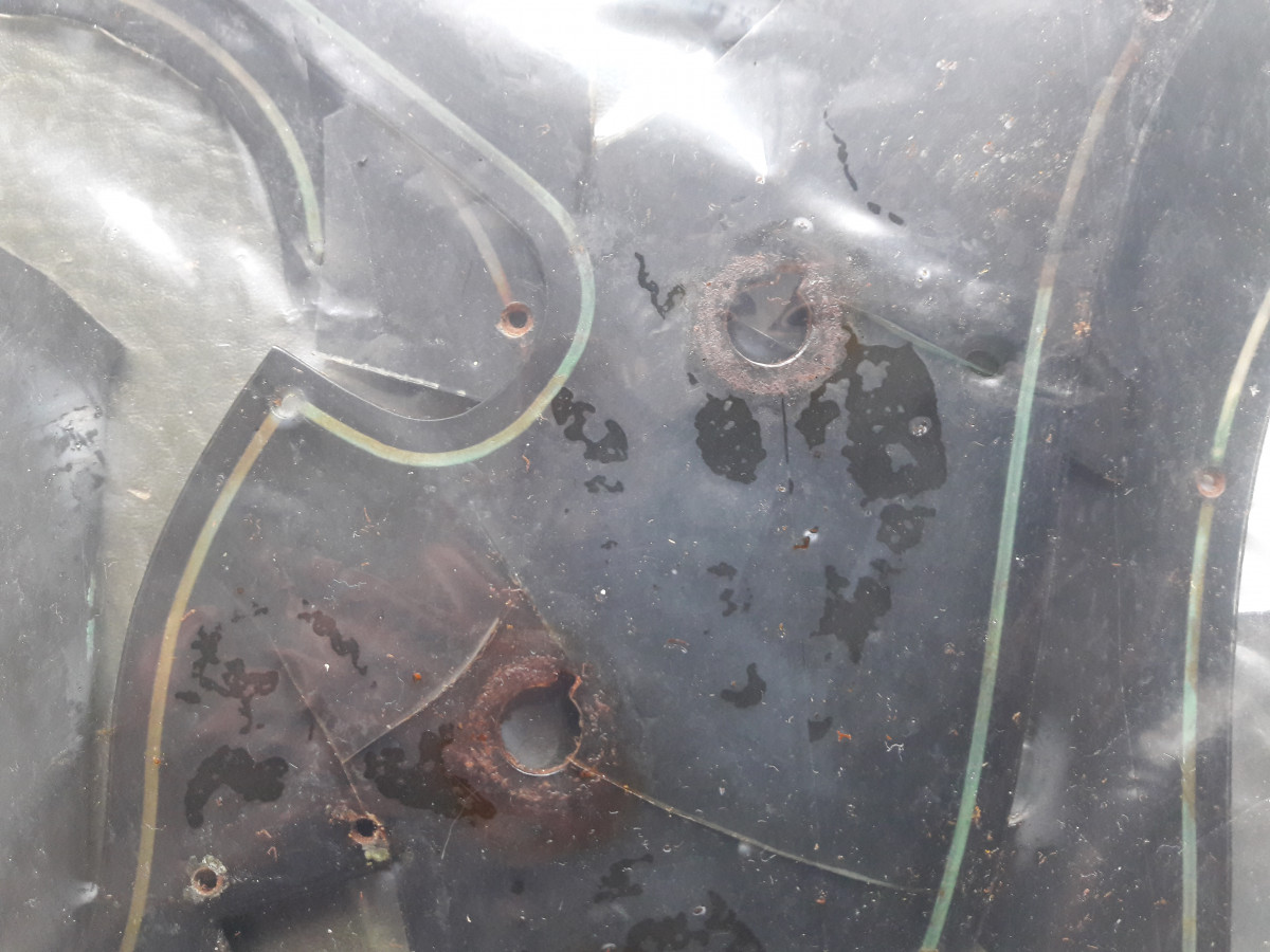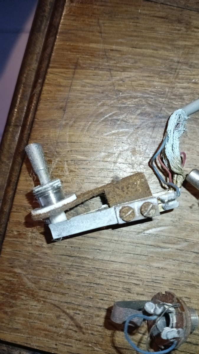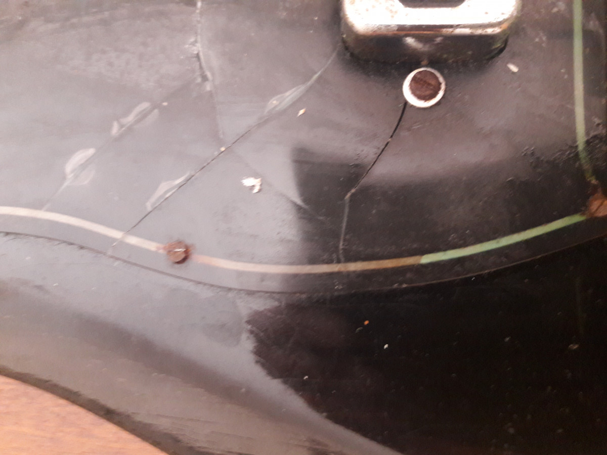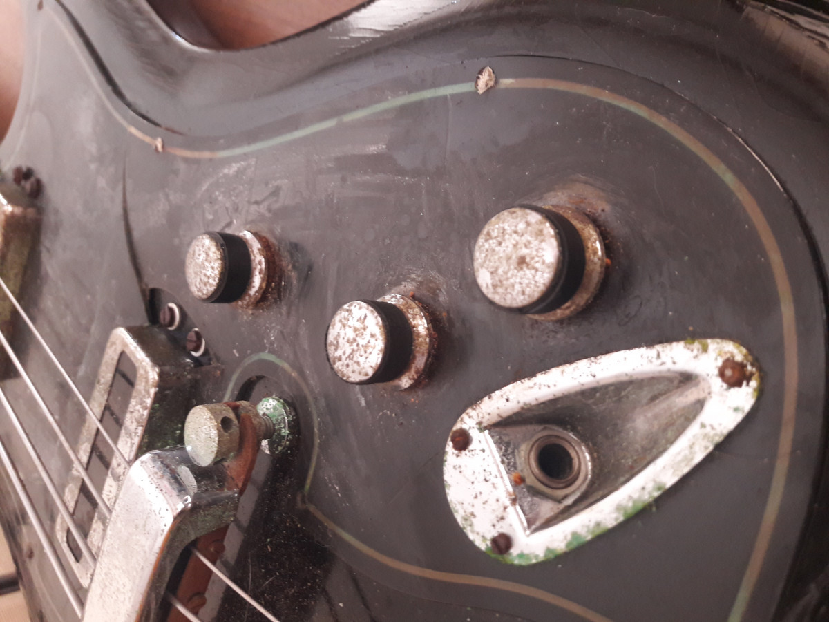 La basse est arrivée en bon état, je l'ai utilisée assez peu (j'ai toujours le jeu de cordes que j'ai monté en la prenant en main). Ce qui est étonnant (mais pas drôle) c'est qu'au fil des ans, elle a commencé à se corroder d'abord doucement puis à une vitesse inexplicable pour moi. Ca a commencé par la peinture du liseré dorée à l'envers du pickgard qui est transparent. Le liseré est devenu vert (oxyde de cuivre). Ensuite des petites piqures sont venues sur les chromes (caches micros, boutons). L'électronique a fini par poser des problèmes (1 micro puis les 2) et elle ne donne plus rien. Le pickgard (qui avait un pet) est également fendu dans plusieurs directions. La partie inférieure, non chromée, du pontet est toute rouillée alors que c'est une partie que je ne touche jamais Je viens de décider de me pencher sur le problème et de commencer à la demonter. Déjà même le petites vis (fer) qui tiennent le pickgard et qui normalement, même corrodées, s'enlèvent toutes seules (pas de contact métal sur métal) étaient tellement oxydées que j'en ai foiré la moitié. Une fois ouvert c'est Verdun! Les vis et ressorts des micros sont tout rouillés et j'ai assez de poudre d'oxyde de cuivre (bleu celui là) pour traiter un vignoble (la tresse de cuivre qui entoure les cables part en poussière bleue) J'espère que les micros ont échapé au désastre (je en les ai pas encore testé seuls), même le truss rod a pris !.