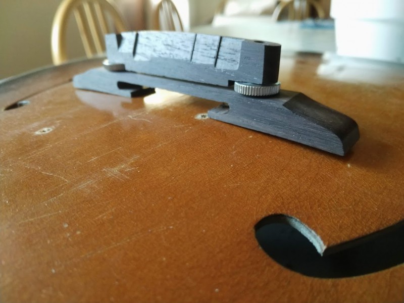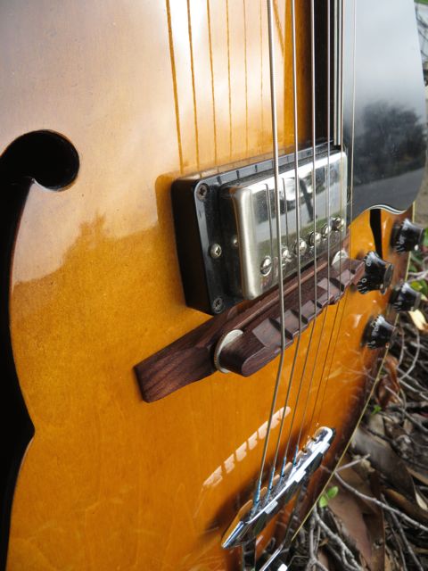 Je cherche à poser un chevalet flottant sur une Egmond archtop à ouïes, petite guitare élec jazz des années 60.