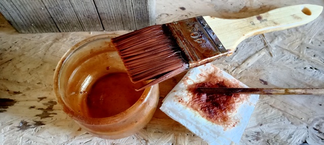 En résumé : Une première couche d'huile de lin pour affirmer la couleur puis ensuite plusieurs couches – quatre en tous - de vernis à l'huile de lin plus gomme de dammar plus essence de térébenthine pure gemme avec séchage de plusieurs semaines entre chaque couche. Une dernière couche contenant une légère coloration à l'argile « rouge » posée vers la mi-juin. (voir les trois premières photos ci-dessous)