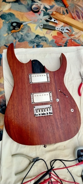 Hier, Ponçage puis lustrage avant remontage et réglage de la guitare avec ses nouveaux micros SP Custom Origine 59', son nouvel électronique comprenant un sélecteur trois position, un volume et un switch de splitt des micros ré-équilibrés chacun par une résistance individuelle de 1k8 afin d'avoir un son un peu plus épais et puissant pour se rapprocher un peu plus du son d'un micro simple standard.