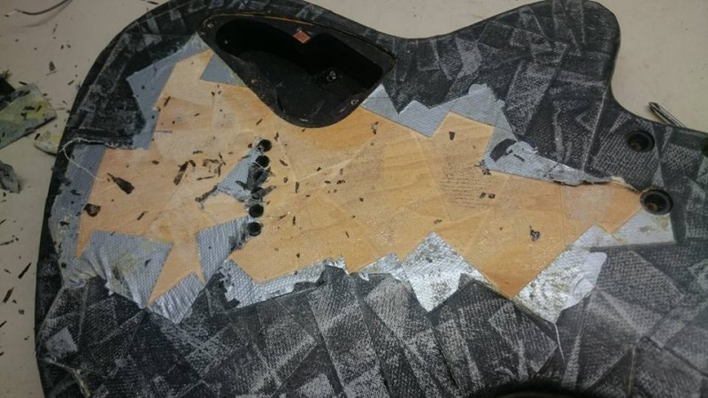 J'ai opté pour une finition "One Dollars" pour le corps et une tête noire avec décal argenté. l'intégralité de la guitare sera donc démontée et décapée. La tête sera repeinte et le manche reverni. Le corps sera quant à lui décapé, repeint (base blanche) et recouvert de billets de 1 dollars, puis reverni par dessus. Enfin un couple de micros EMG remplacera les doubles d'origine et la cavité du simple sera masque par un pickguard fait sur mesure. A noter que d'origine tout l'accastillage est noir, et reste tel qu'il était, ce qui sera un bon rappel de la tête.
