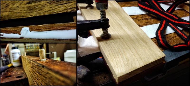 Pour ce faire j'ai utilisé des chevilles en bois et de la colle à bois pour maintenir l'ensemble. Maintenues pendant une nuit, serrées (serre joint et sangle à cliquet dans mon cas, je n'avais que ça sous la main, les cornières en métal servent à répartir la charge et à ne pas faire de marque là où passe la sangle.).
