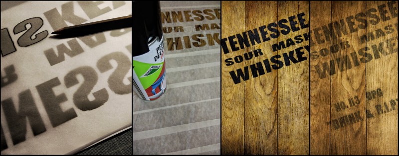 J'ai réalisé un pochoir à l'aide de bande de masquage (rouleau scotch pour protéger quand on peint), que j'ai appliqué sur la partie à peindre, j'ai pris le soin de masquer le reste, j'ai bombé et, après séchage j'ai passé l'ensemble de la planche à la paille de fer 00 pour estomper les inscriptions. Voici le rendu.