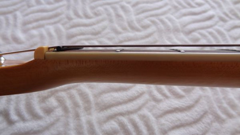 à l'occasion je vais refaire plus propre la frette en carbone, afin de mieux épouser la forme du manche et le radius, mieux aligner les cordes par rapport au sillet (le D aigu sort un peu du logement) et rectifier la hauteur de chaque corde une par une...