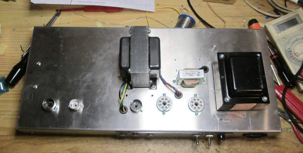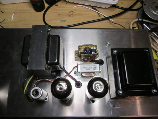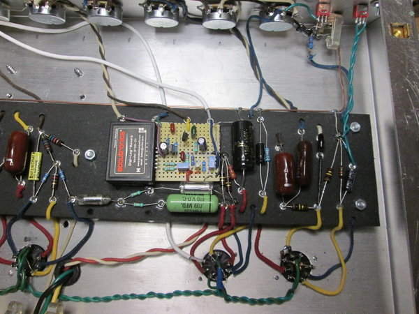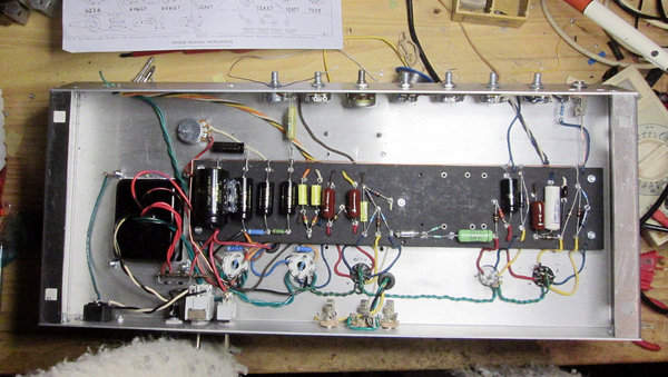 Les composants sont un mix de carbon comp et condos polyester sur le chemin du signal et des couches metal faible bruit aux endroits sensibles au bruit (fuite de grille). Chimiques F&T. Transfo d'alim Hammond (un 290EEX) et de sortie Classictone (40-18008 ) et une self Hammond également.